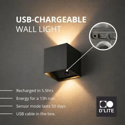 Beschreibung D'Lite Wandleuchte Elingen Aluminium Schwarz Up & Down 2.9W 170lm - 830 Warmweiß | IP65 - Batteriebetrieben - Lichtsensor