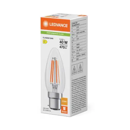 Die Ledvance Classic LED B22 Kerze Fadenlampe Klar 3.4W 470lm - 827 Extra Warmweiß | Ersatz Für 40W ist eine effiziente B22 (Bajonettsockel) LED-Lampe mit Retrodesign und der perfekte Ersatz für Ihre konventionellen 40W Lampen mit B22 (Bajonettsockel). Zudem strahlt sie Licht in der Farbtemperatur aus und punktet durch eine lange Lebensdauer.