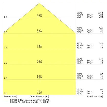 Der Abstrahlwinkel bezeichnet den Winkel, in dem das Licht aus der Lichtquelle ausgestrahlt wird. Er wird in Grad (D) angegeben. Je geringer die Gradzahl des Abstrahlwinkels ist, desto kleiner ist auch der Durchmesser des Lichtkegels, den die Lichtquelle produziert. Beispiel: Wird eine Lampe mit einem Abstrahlwinkel von 60 Grad an der Decke (2,5 m Höhe) angebracht, erzeugt sie einen Lichtkegel von 2,9 Metern Durchmesser. Hat die Lampe hingegen einen Abstrahlwinkel von 120 Grad, beträgt der Lichtkegel 8,7 Meter im Durchmesser. |