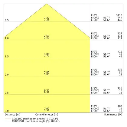 Der Abstrahlwinkel bezeichnet den Winkel, in dem das Licht aus der Lichtquelle ausgestrahlt wird. Er wird in Grad (D) angegeben. Je geringer die Gradzahl des Abstrahlwinkels ist, desto kleiner ist auch der Durchmesser des Lichtkegels, den die Lichtquelle produziert. Beispiel: Wird eine Lampe mit einem Abstrahlwinkel von 60 Grad an der Decke (2,5 m Höhe) angebracht, erzeugt sie einen Lichtkegel von 2,9 Metern Durchmesser. Hat die Lampe hingegen einen Abstrahlwinkel von 120 Grad, beträgt der Lichtkegel 8,7 Meter im Durchmesser. |