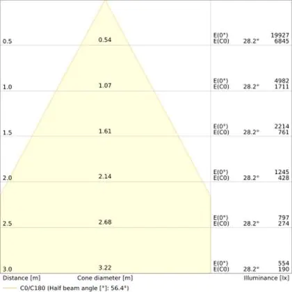 Der Abstrahlwinkel bezeichnet den Winkel, in dem das Licht aus der Lichtquelle ausgestrahlt wird. Er wird in Grad (D) angegeben. Je geringer die Gradzahl des Abstrahlwinkels ist, desto kleiner ist auch der Durchmesser des Lichtkegels, den die Lichtquelle produziert. Beispiel: Wird eine Lampe mit einem Abstrahlwinkel von 60 Grad an der Decke (2,5 m Höhe) angebracht, erzeugt sie einen Lichtkegel von 2,9 Metern Durchmesser. Hat die Lampe hingegen einen Abstrahlwinkel von 120 Grad, beträgt der Lichtkegel 8,7 Meter im Durchmesser. |