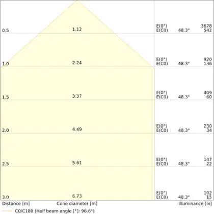 Der Abstrahlwinkel bezeichnet den Winkel, in dem das Licht aus der Lichtquelle ausgestrahlt wird. Er wird in Grad (D) angegeben. Je geringer die Gradzahl des Abstrahlwinkels ist, desto kleiner ist auch der Durchmesser des Lichtkegels, den die Lichtquelle produziert. Beispiel: Wird eine Lampe mit einem Abstrahlwinkel von 60 Grad an der Decke (2,5 m Höhe) angebracht, erzeugt sie einen Lichtkegel von 2,9 Metern Durchmesser. Hat die Lampe hingegen einen Abstrahlwinkel von 120 Grad, beträgt der Lichtkegel 8,7 Meter im Durchmesser. |