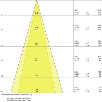Der Abstrahlwinkel bezeichnet den Winkel, in dem das Licht aus der Lichtquelle ausgestrahlt wird. Er wird in Grad (D) angegeben. Je geringer die Gradzahl des Abstrahlwinkels ist, desto kleiner ist auch der Durchmesser des Lichtkegels, den die Lichtquelle produziert. Beispiel: Wird eine Lampe mit einem Abstrahlwinkel von 60 Grad an der Decke (2,5 m Höhe) angebracht, erzeugt sie einen Lichtkegel von 2,9 Metern Durchmesser. Hat die Lampe hingegen einen Abstrahlwinkel von 120 Grad, beträgt der Lichtkegel 8,7 Meter im Durchmesser. |