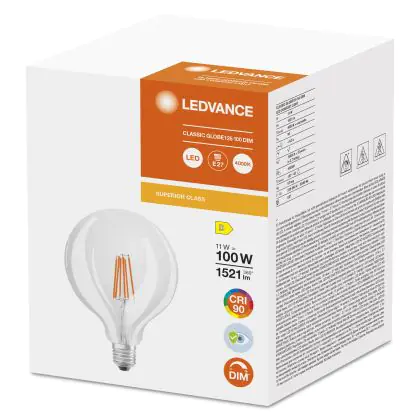 Die Ledvance Superior Classic LED E27 Globe Fadenlampe Klar 11W 1521lm - 940 Kaltweiß | Höchste Farbwiedergabe ist eine effiziente E27 LED-Lampe mit Retrodesign und der perfekte Ersatz für Ihre konventionellen 100W Lampen mit E27. Zudem strahlt sie Licht in der Farbtemperatur 4000K - Kaltweiß aus und punktet durch eine lange Lebensdauer.