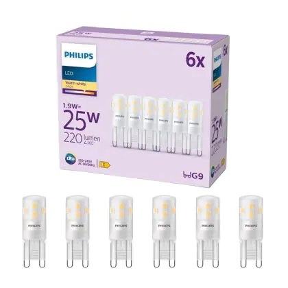 Die Mehrfachpackung 6x Philips LED Capsule G9 Matt 1.9W 220lm - 827 Extra Warmweiß ist eine effiziente G9 LED-Lampe und der perfekte Ersatz für Ihre konventionelle Halogenlampe mit W und einem G9-Sockel. Die Stifte haben einen Abstand von 9 mm. Zudem strahlt das Produkt Licht in der Farbtemperatur 2700K - Extra Warmweiß aus und punktet durch eine lange Lebensdauer.