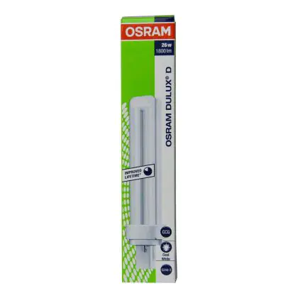 Die Osram Dulux D mit 26 Watt kommt mit 2 Stiften und einer neutralen kaltweißen Lichtfarbe daher. Zudem überzeugt die Lampe mit einer 3-jährigen Lebendauer und einer 1-jährigen All-in-Garantie.