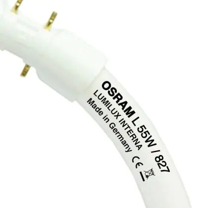Die Osram T5 FC 55W/827 Circline Lumilux Interna 2GX13 ist perfekt für den Einsatz in flachen Leuchten geeignet. Das Licht verteilt sich in alle Richtungen. Sie hat einen 2GX13 Lampensockel und eine Länge von 310 mm.