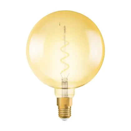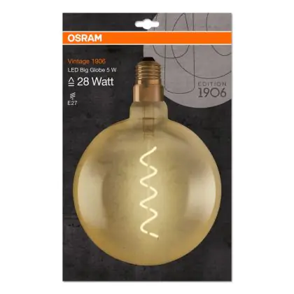 Die Osram Vintage 1906 LED E27 Globe 5W 820 Gold | Ersetzt 28W ist eine moderne LED-Lampe mit Vintage-Design. Sie kann ganz einfach herkömmliche Leuchten mit einem E27-Sockel, sowie einem Verbrauch von 28 Watt, ersetzen und ermöglicht damit eine Energieersparnis von bis zu 90 %. Zudem punktet die Lampe mit einer langen Lebensdauer, leuchtet in der Farbtemperatur extra Warmweiß und besitzt einen Leuchtkörper aus Glas in der Gold-Ausführung. Die spiralförmigen Filamente im Inneren sorgen für einen originellen Look und sind ein echter Blickfang.