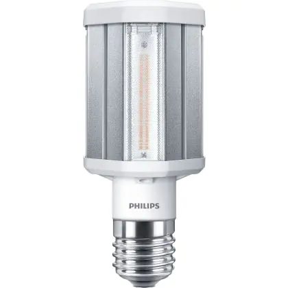 Die Philips TrueForce LED HPL E40 42W 840 Clear strahlt als Außenbeleuchtung mit 360° Abstrahlwinkel ein kaltweißes Licht aus. Die Lichtfarbe hat 4.000 Kelvin und damit einen erhöhten Blauanteil. Das schafft eine neutrale Atmosphäre mit hohem Sehkomfort.