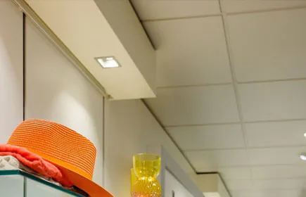 - Im Geschäft wurden nur Leuchten mit weißer Lichtfarbe verwendet, die eine ruhige Decke schaffen. Dadurch wird sichergestellt, dass die Besucher das Sortiment sofort im Blick haben (keine Ablenkung).